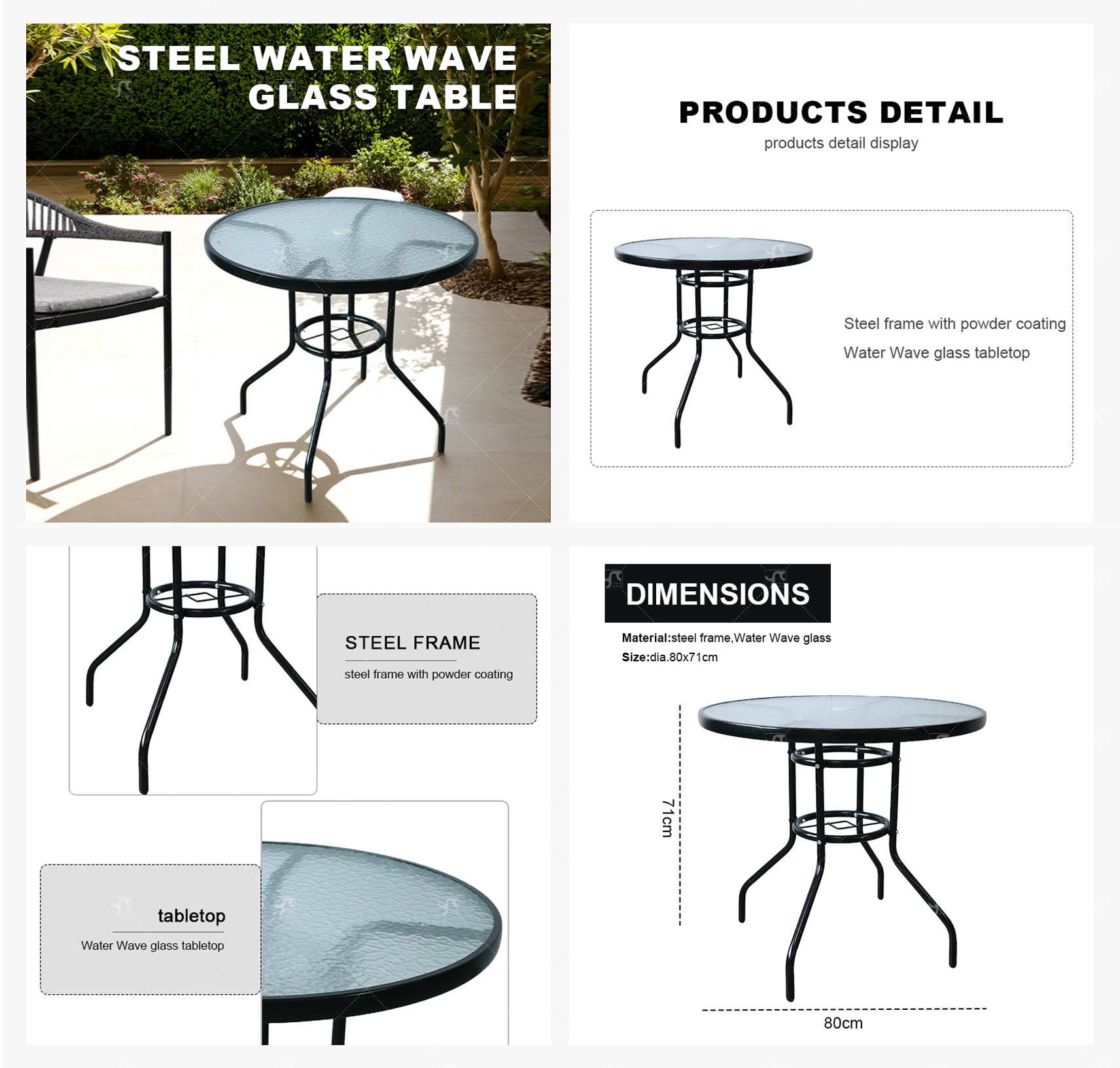 Outdoor Patio Side Table Garden Round Table with Water Wave Glass Tabletop Metal Steel Iron Dining Outdoor Table for Garden