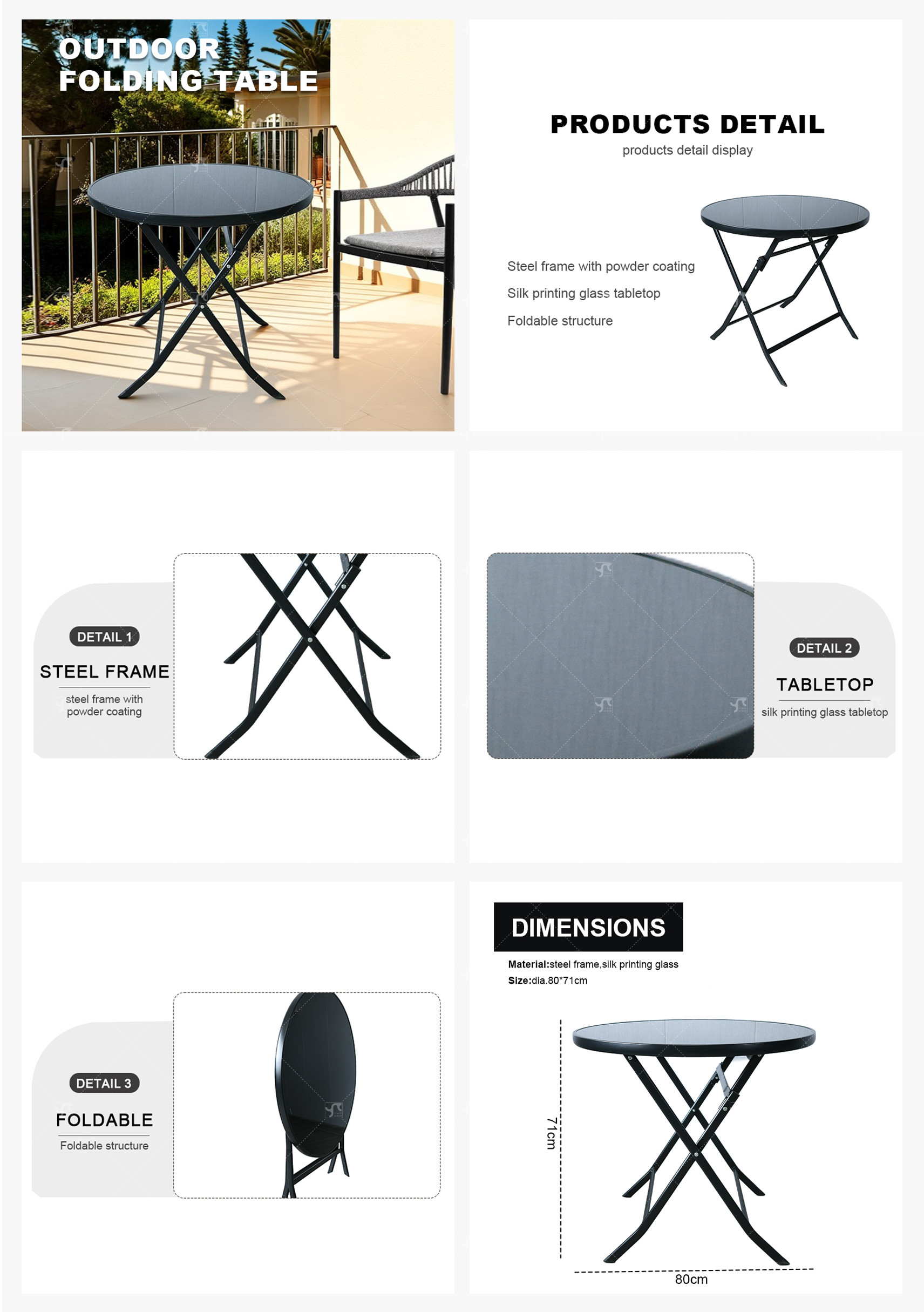 Outdoor Folding Patio Side Table Garden Round Table with Silk Printing Glass Metal Steel Iron Dining Outdoor Table