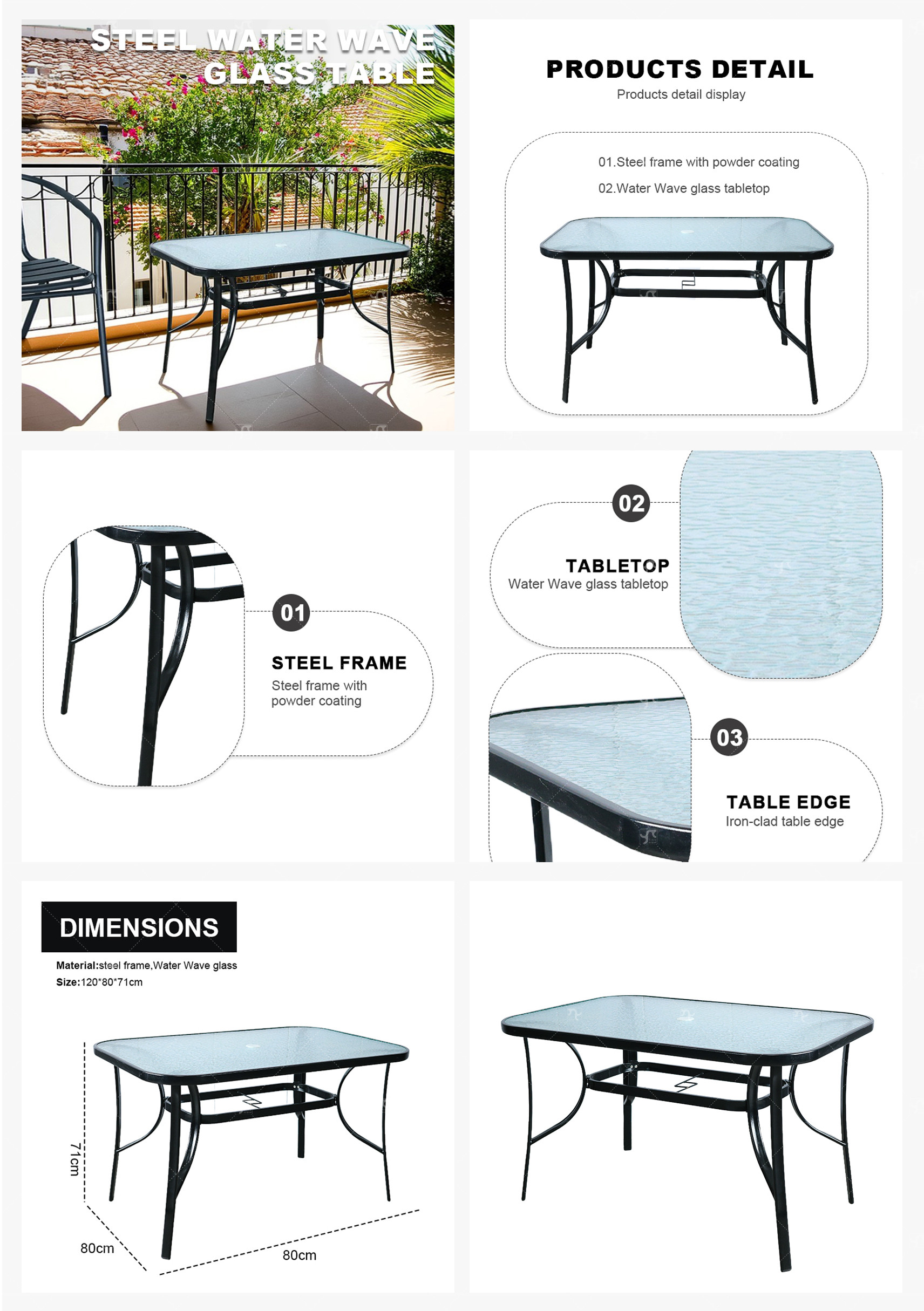 Hot Sale Outdoor Patio Side Square Table Garden Table with Water Wave Glass Metal Steel Iron Dining Outdoor Table