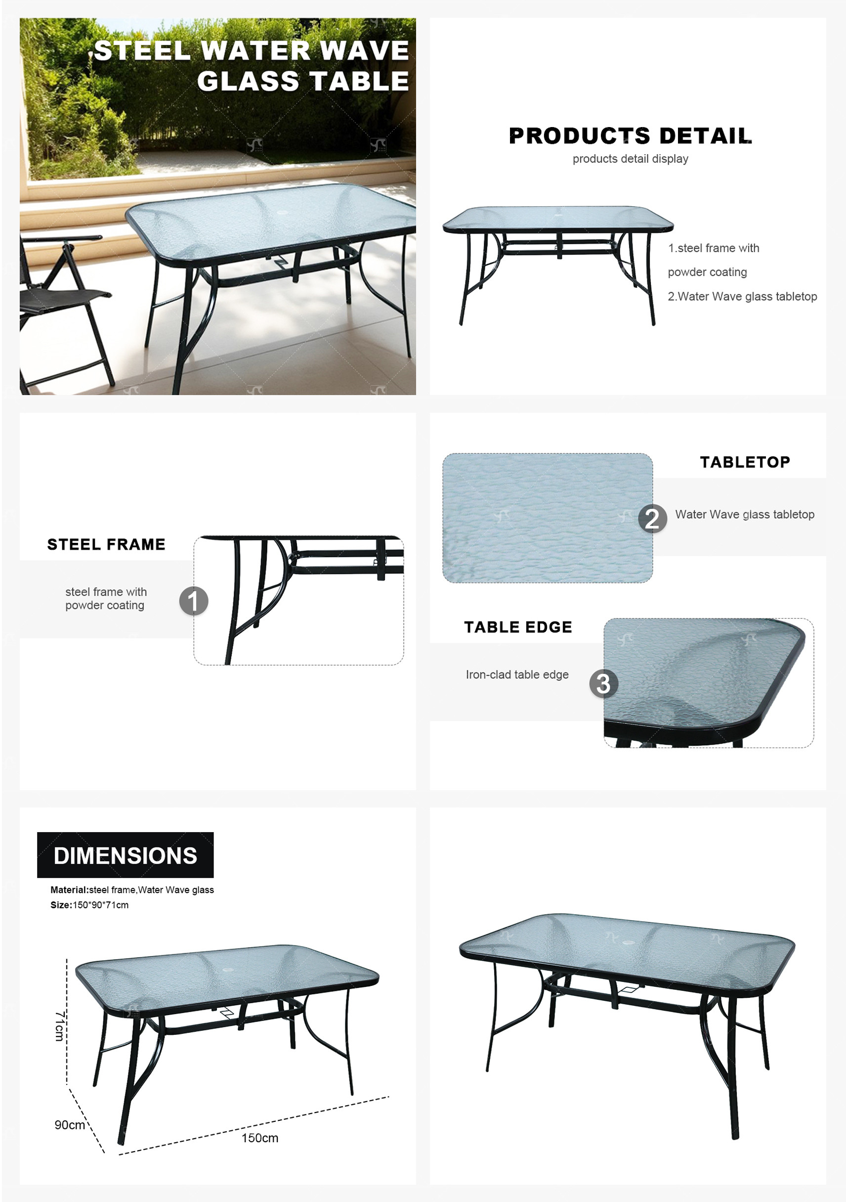 Hot Sale Outdoor Patio Side Square Table Garden Table with Water Wave Glass Metal Steel Iron Dining Outdoor Table
