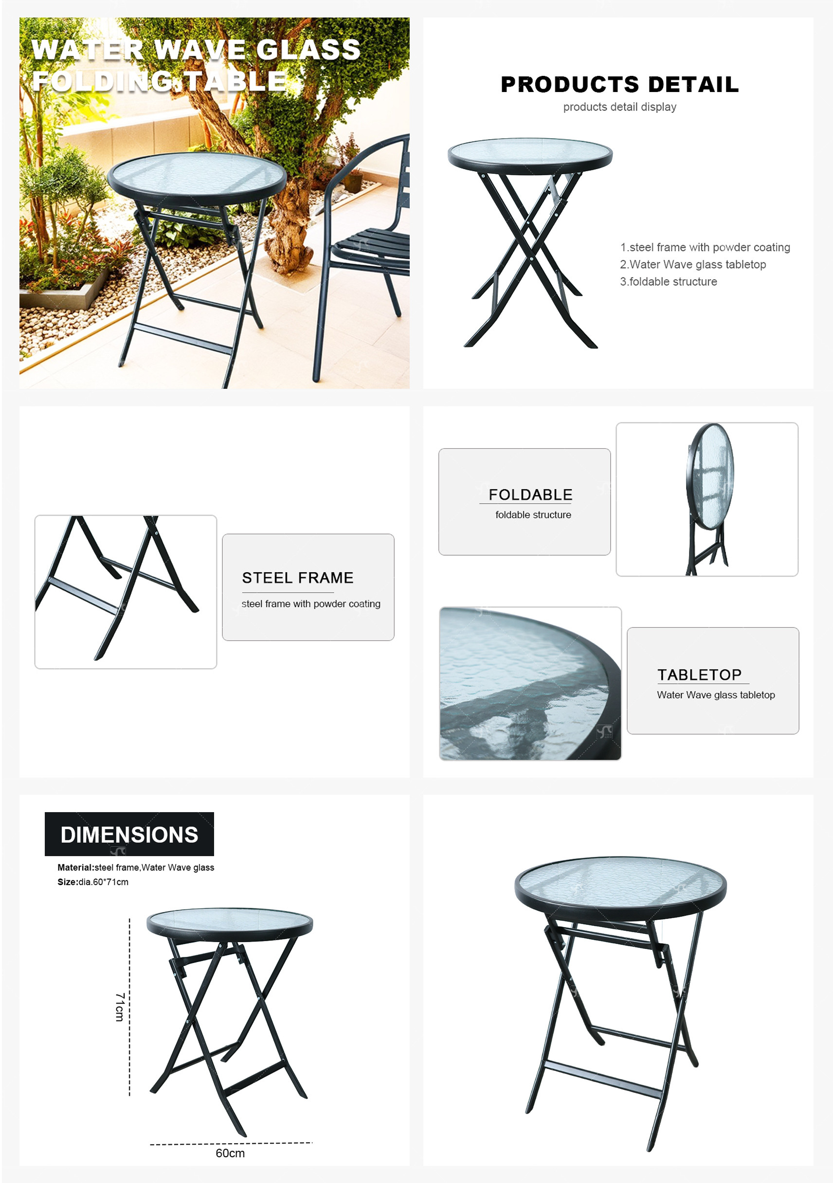 Outdoor Folding Patio Side Table Garden Round Table with Water Wave Glass Metal Steel Iron Dining Outdoor Table for Garden