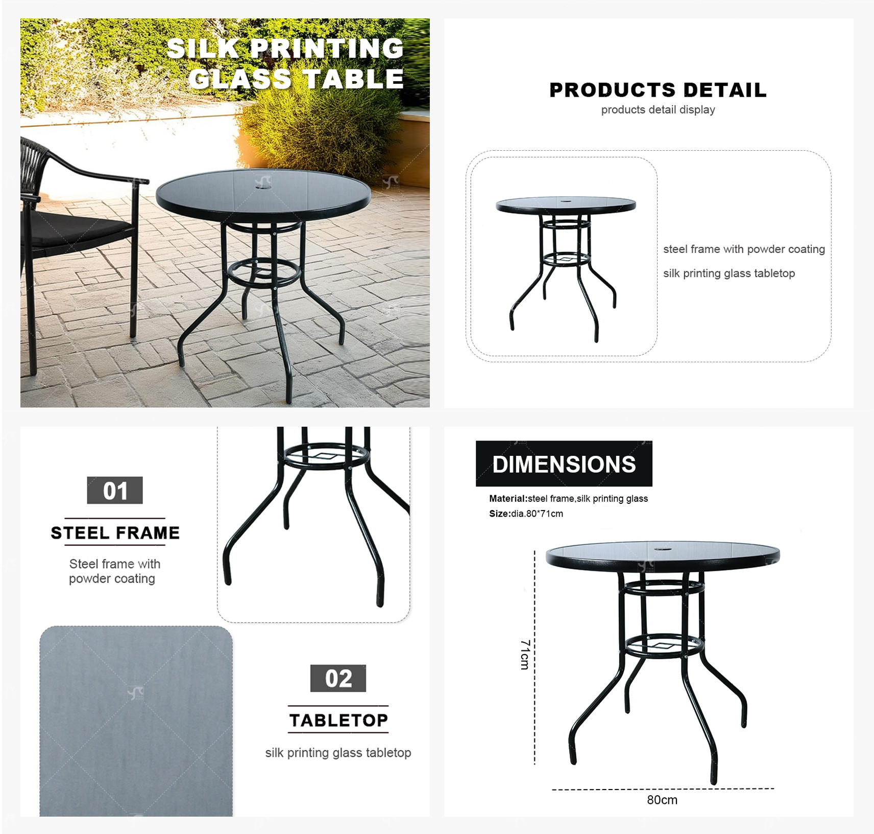 Outdoor Patio Side Table Garden Round Table with Silk Printing Glass Metal Steel Iron Dining Outdoor Table for Garden