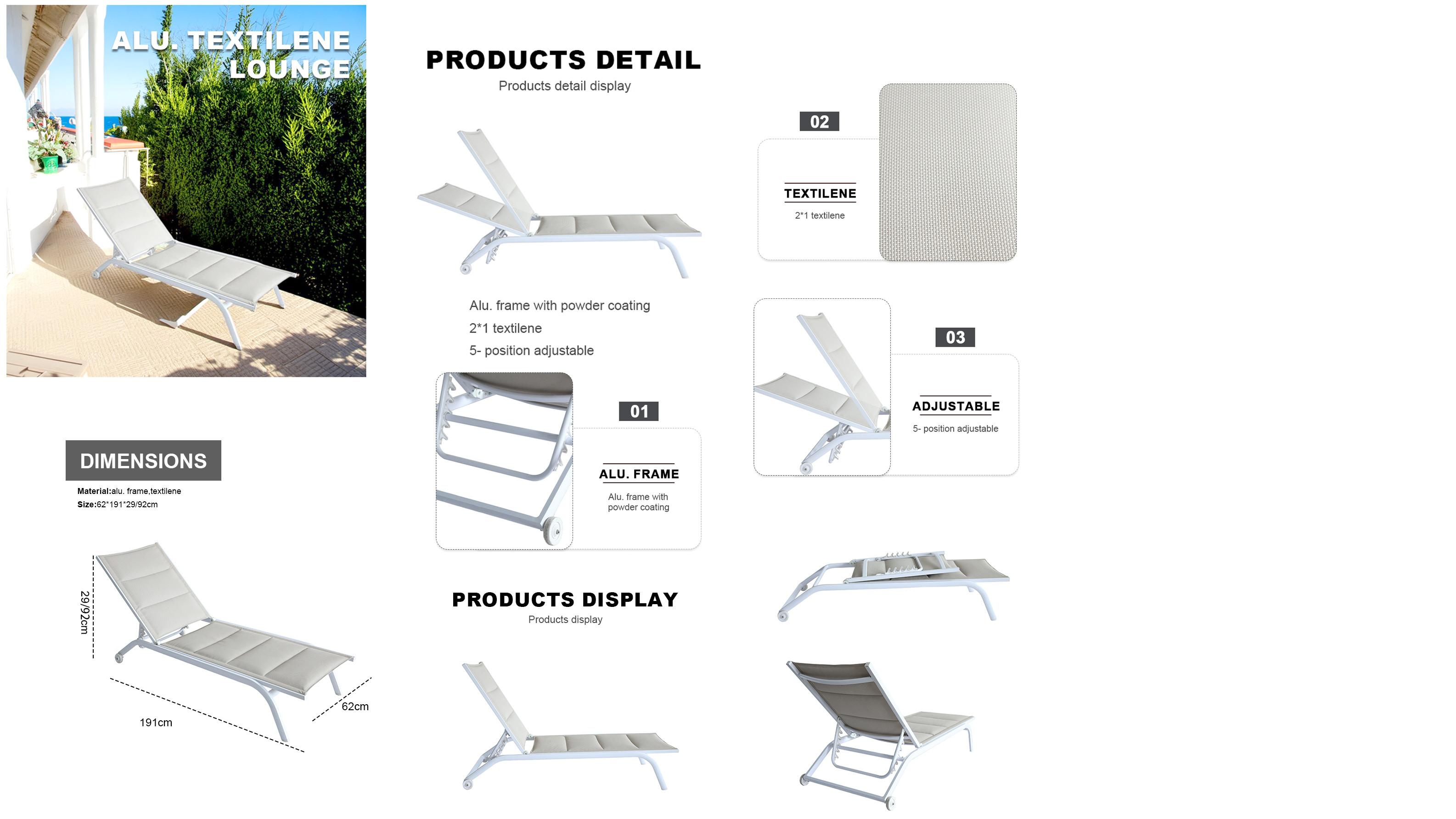 Outdoor Alu Five Position Adjustable Garden Beach Chaise Lounge Chair Patio Garden Hotel Sun Lounge