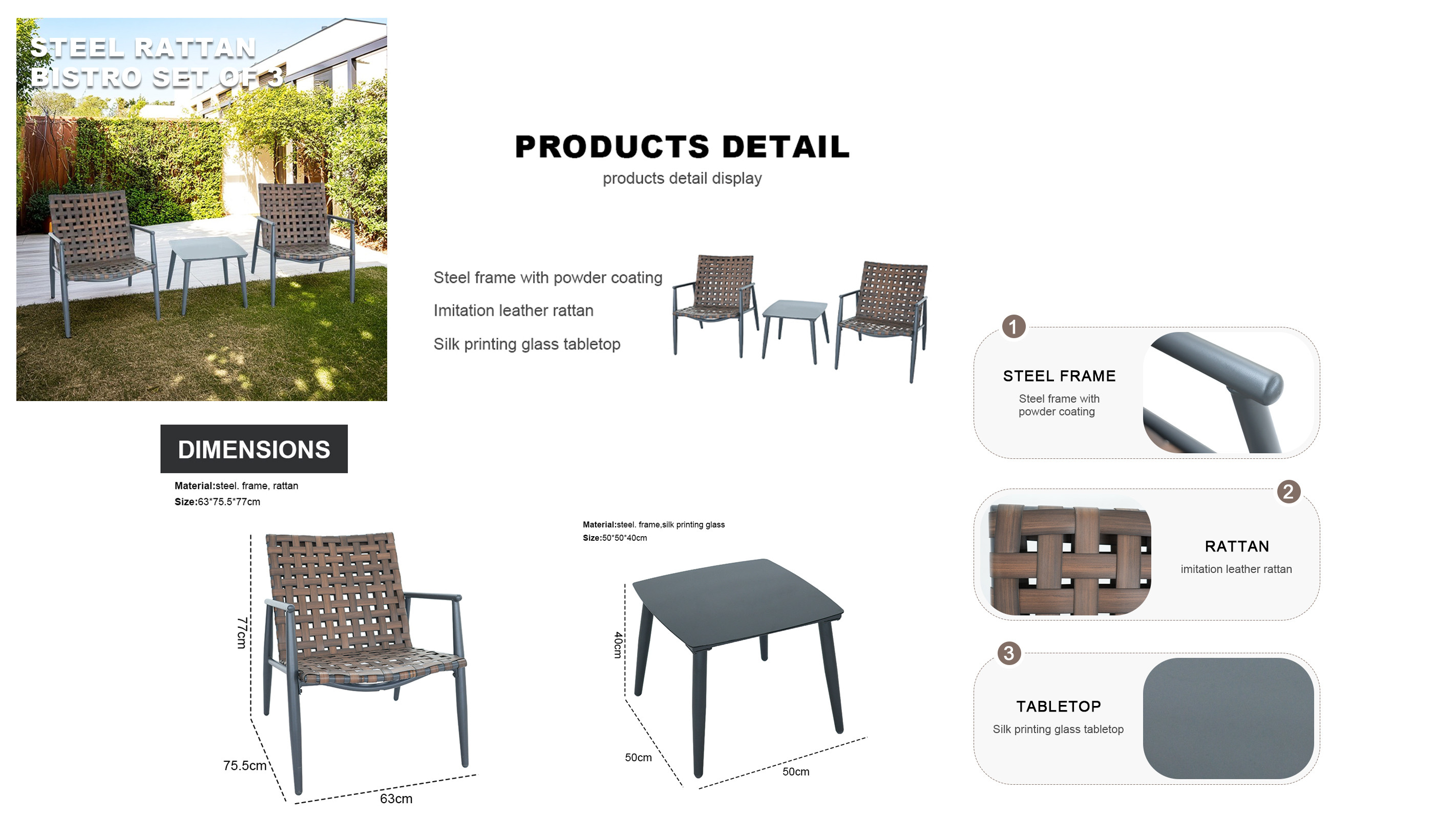 Outdoor 3 Pieces Steel Frame Outdoor Steel Bistro Set Rattan Chair Conversation Sets Garden Furniture with Tempered Glass