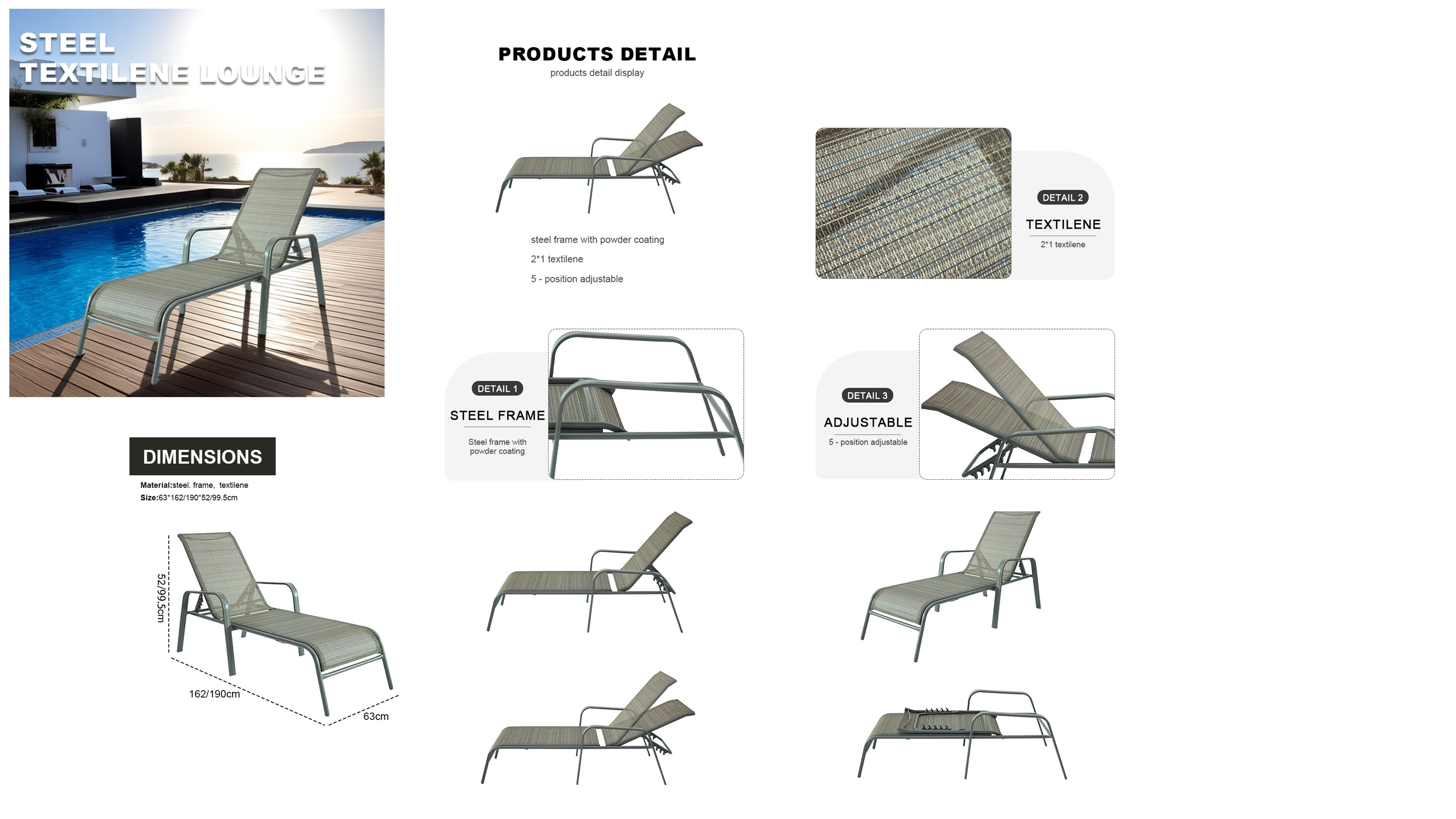 Outdoor Steel Five Position Adjustable Garden Beach Chaise Lounge Chair Patio Garden Hotel Sun Lounge