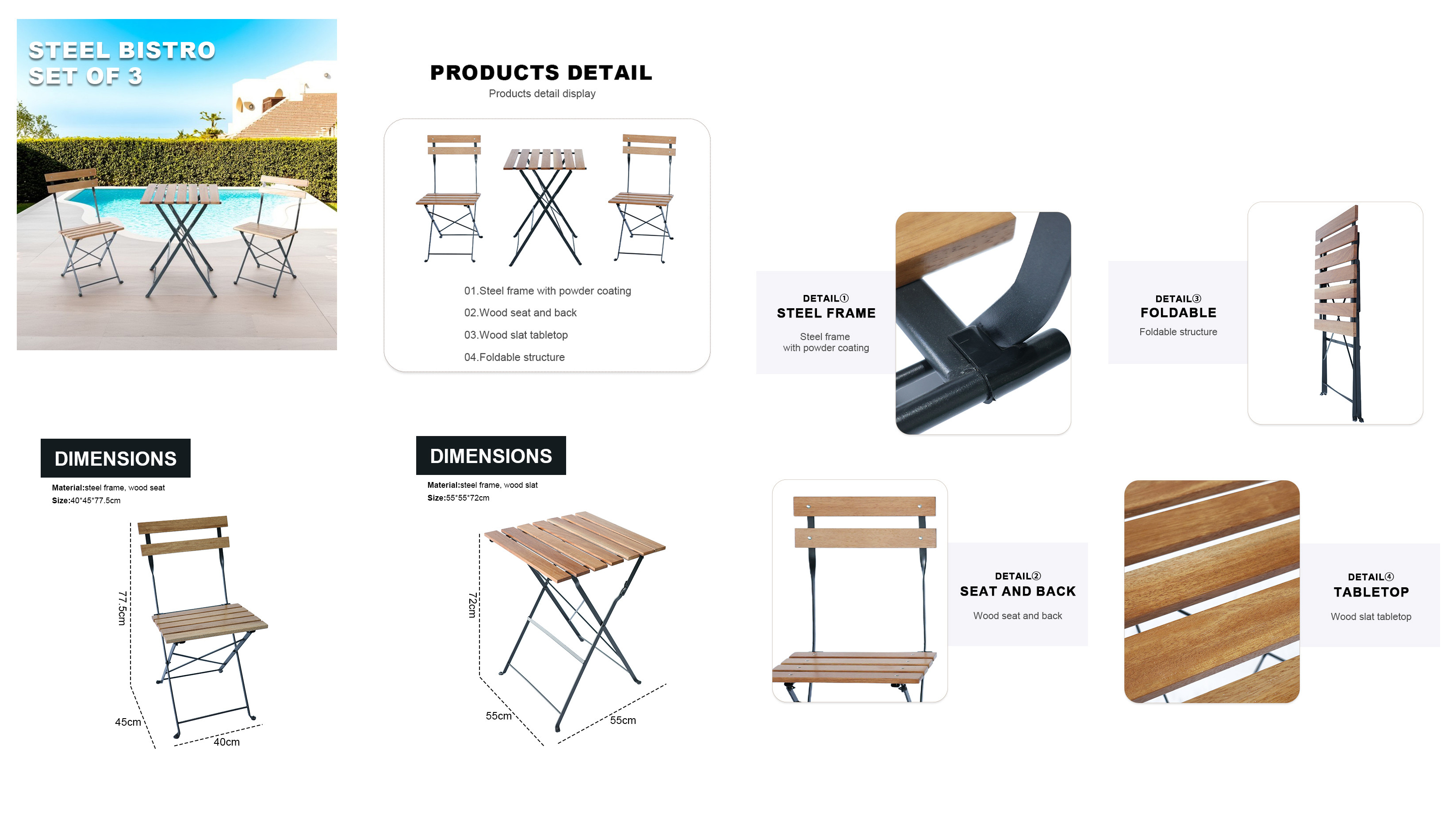 Outdoor Coffee Sets Foldable Wood Slat Table and Foldable Chair Camping Patio Dinning Steel Garden Chair Three-piece Sets