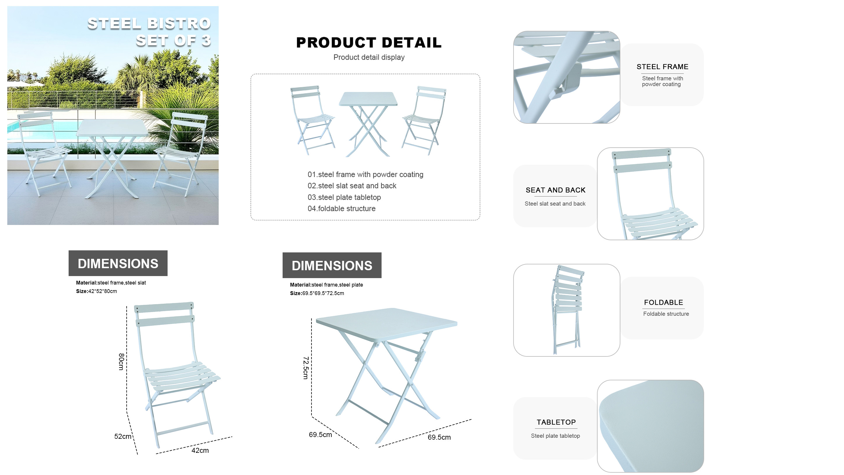 Outdoor Coffee Sets Foldable Steel Plate Table and Foldable Chair Camping Patio Dinning Steel Garden Chair Three-piece Sets