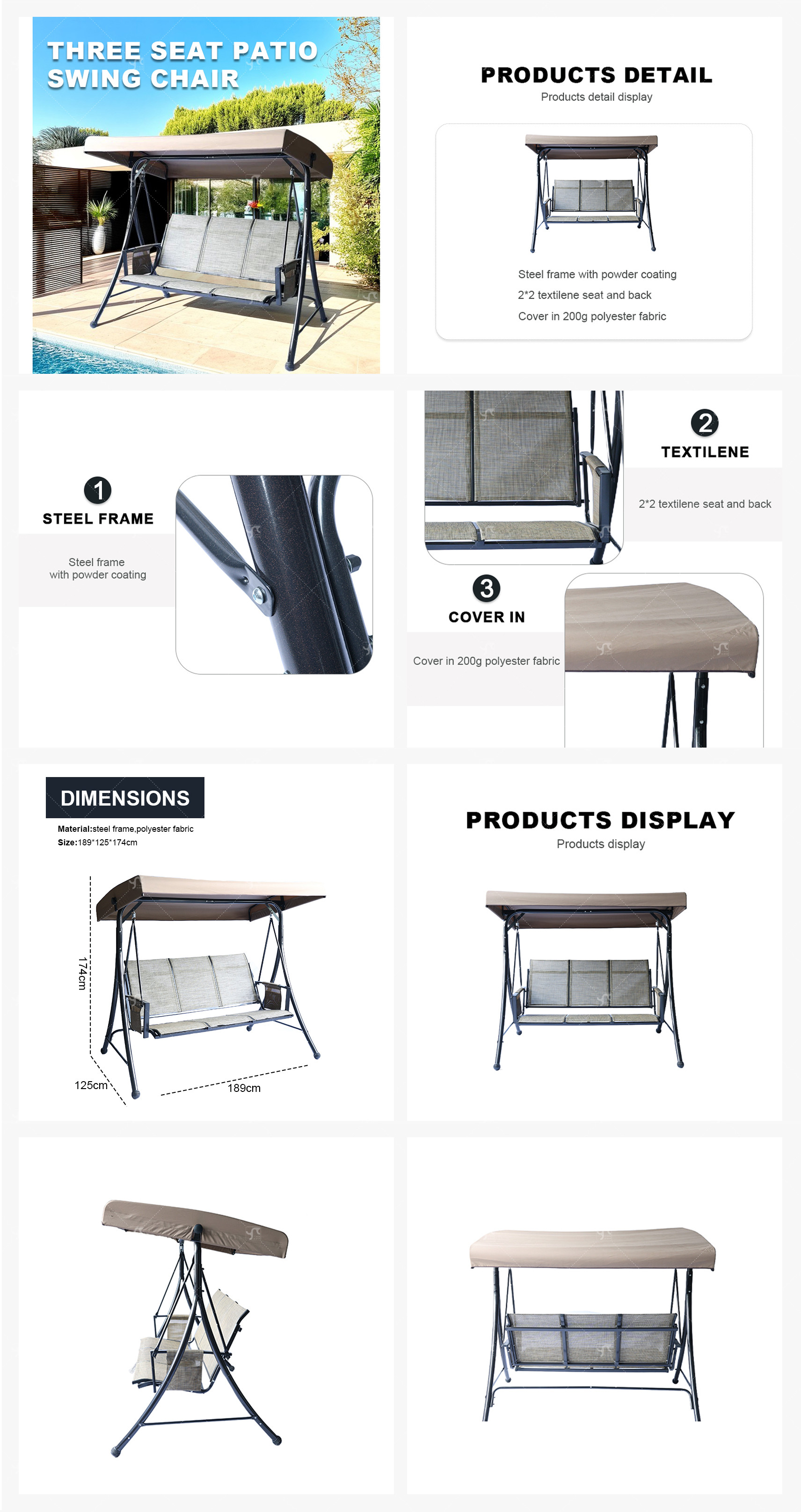 3-Person Metal Frame Swing Chair for Outdoor Terrace Beach Garden Waterproof Canopy for Living Room Outdoor Furniture Swing
