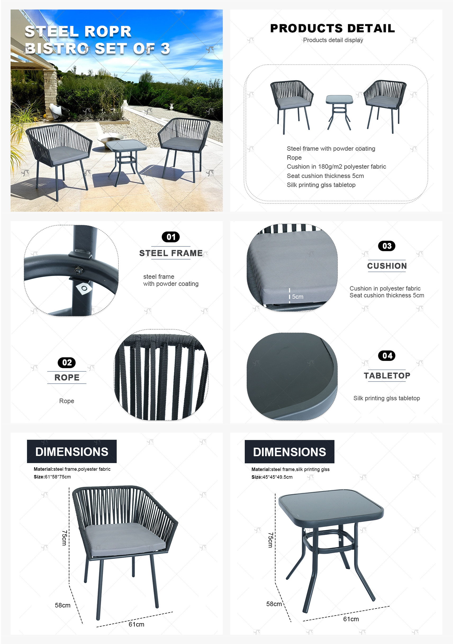 Modern steel Rattan Rope Woven Hotel Resort Patio Dining Chairs Outdoor Garden Furniture table and chair Set of 3