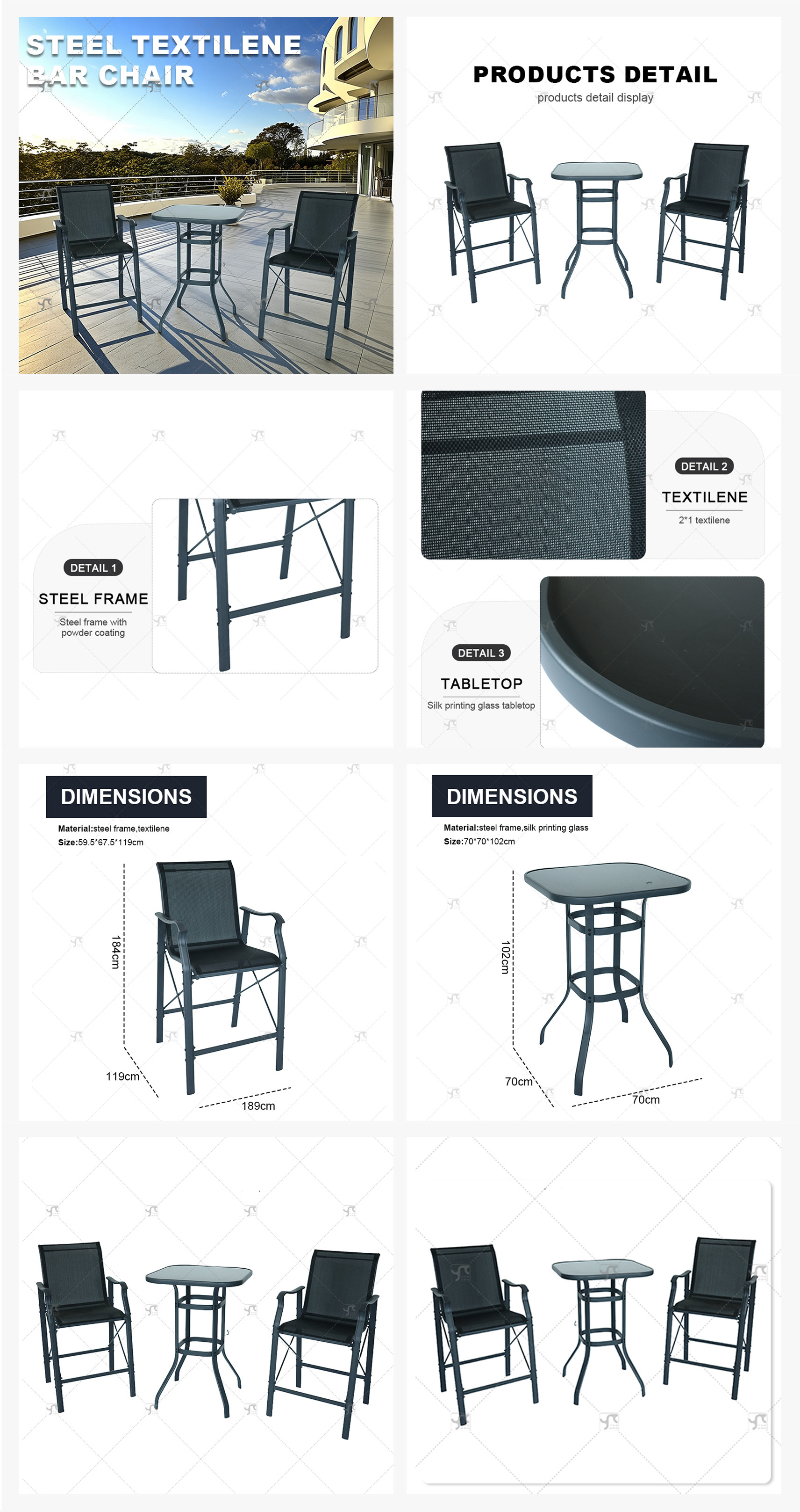 Outdoor Silk Printing Glass Bistro Table and Metal Outdoor Stool Set Square 2 -Person Long Bar Height bar Chair Set of 3