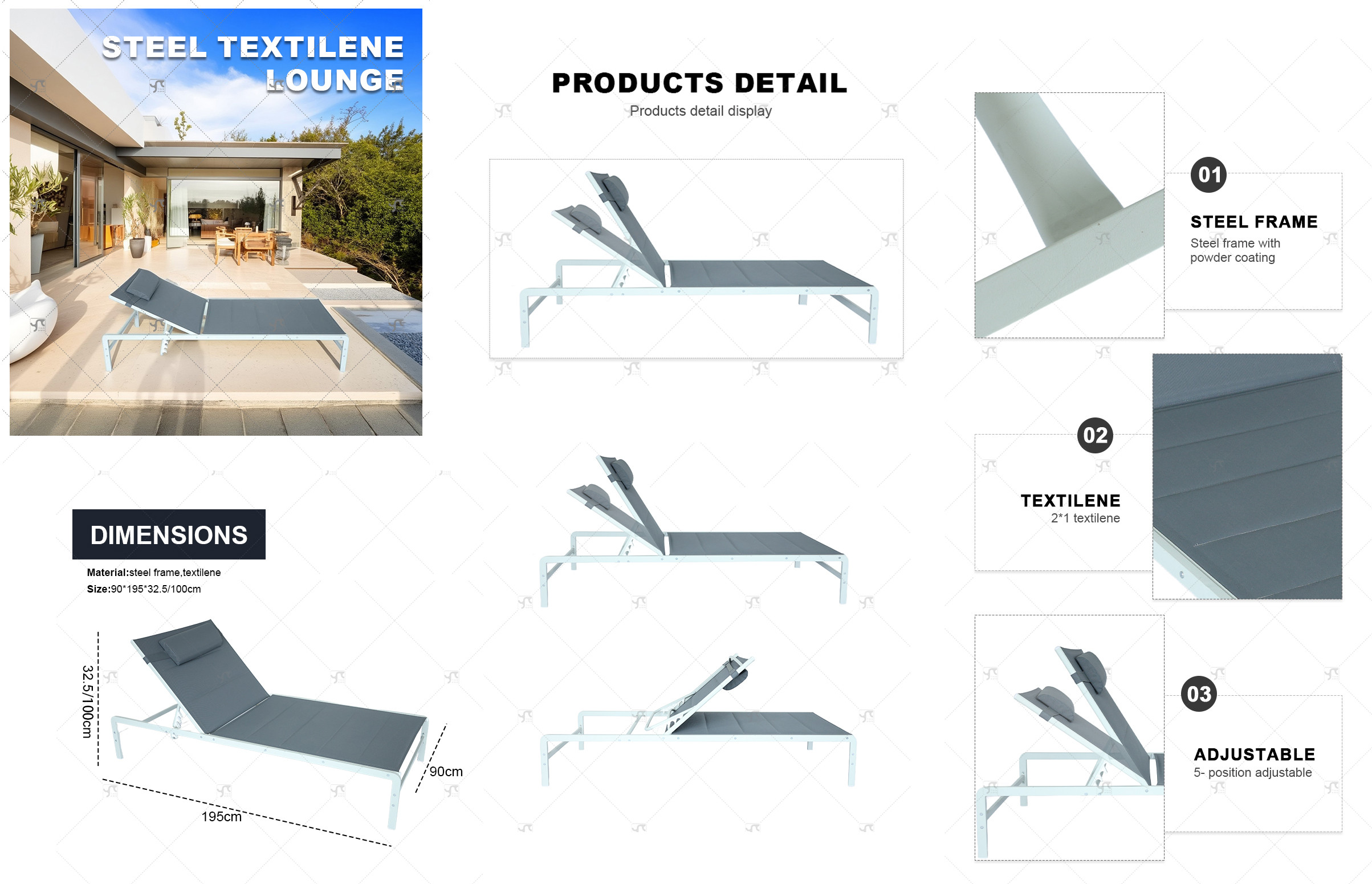 Outdoor Steel Five Position Adjustable Garden Beach Chaise Lounge Chair Patio Garden Hotel Sun Lounge