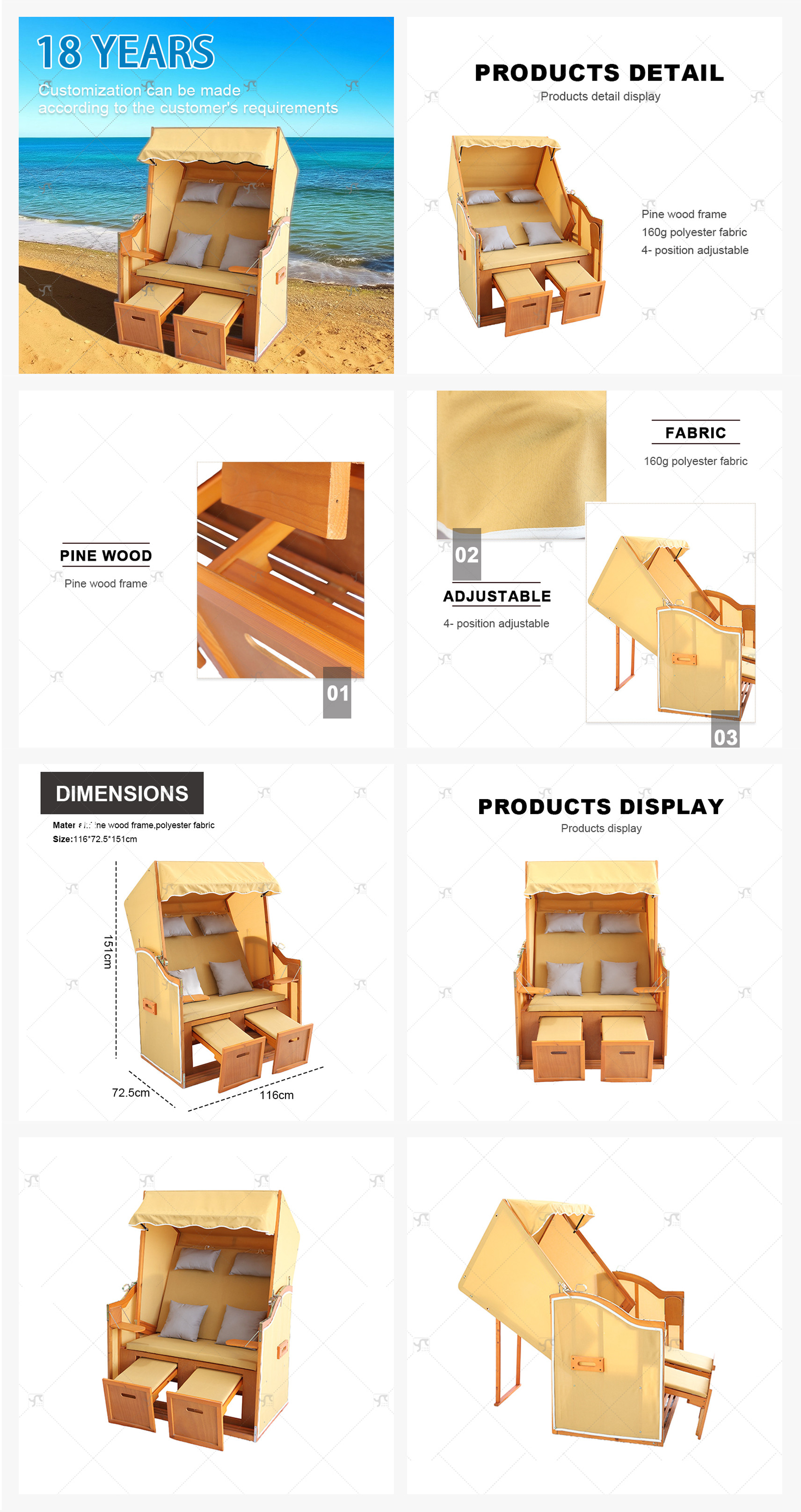 Outdoors Beach Chair 2-Seater Fully Reclining Wood Furniture 4-Way Adjustable Backrest Side Tables Protective Cover Cushion