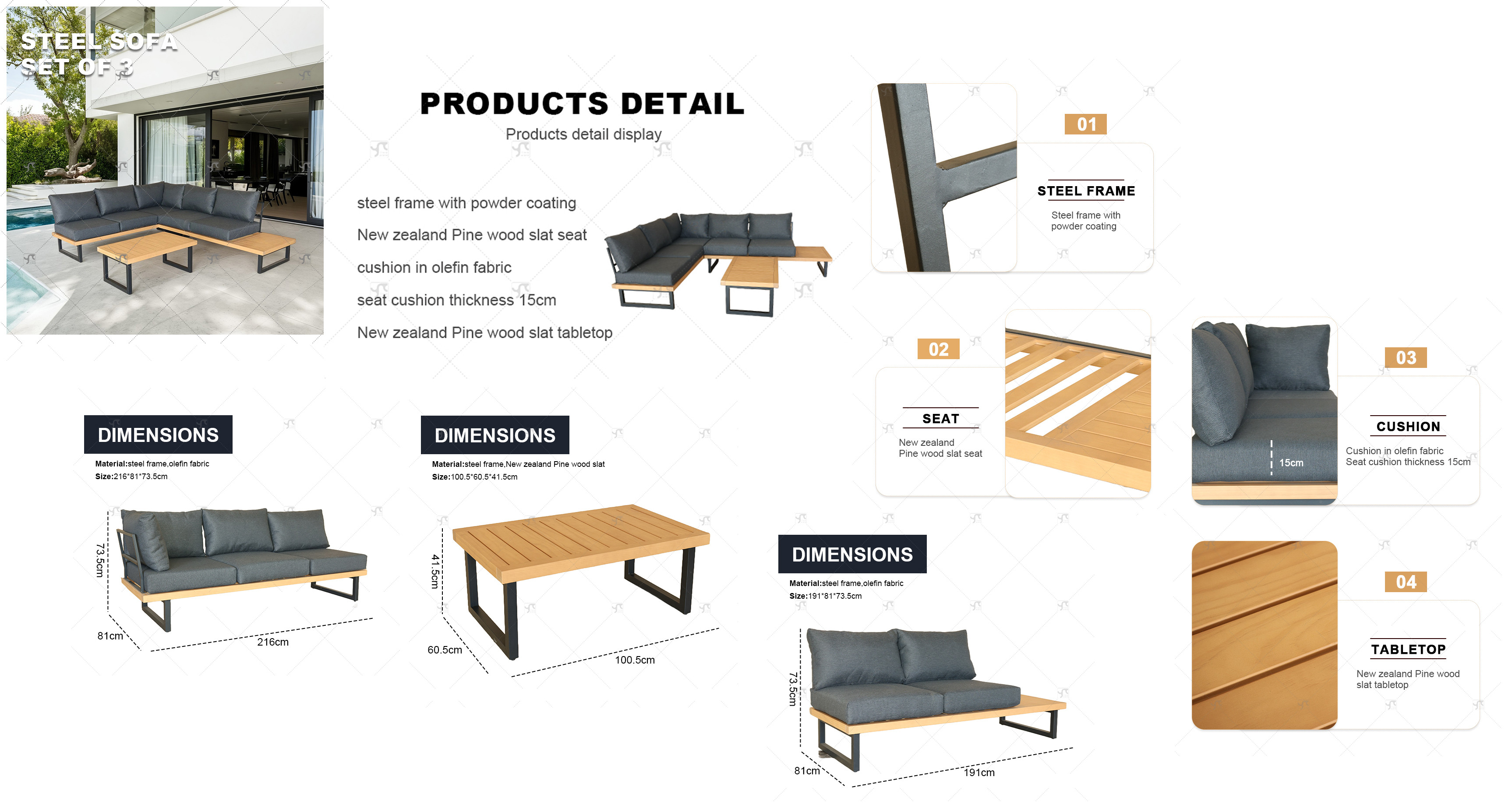Outdoor Modern Patio Lounge Corner Sofa Set of 3 Furniture Outdoor Garden L Shaped Steel Conversation Set with Coffee Table Set