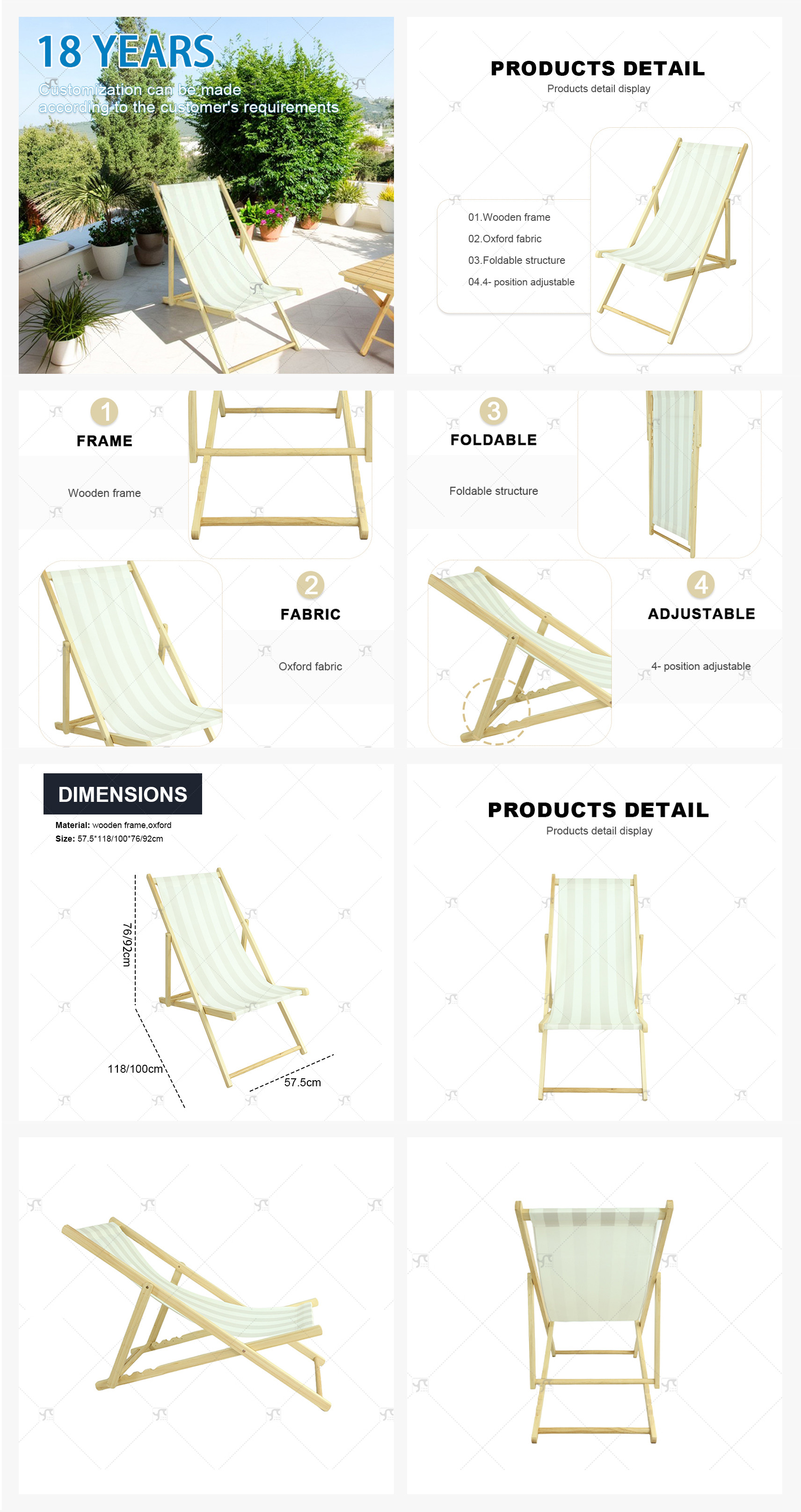Outdoor Furniture Wooden Outdoor Lounge Chair Foldable Durable Oxford Fabric Light Weight for Balcony Garden Park or Beach