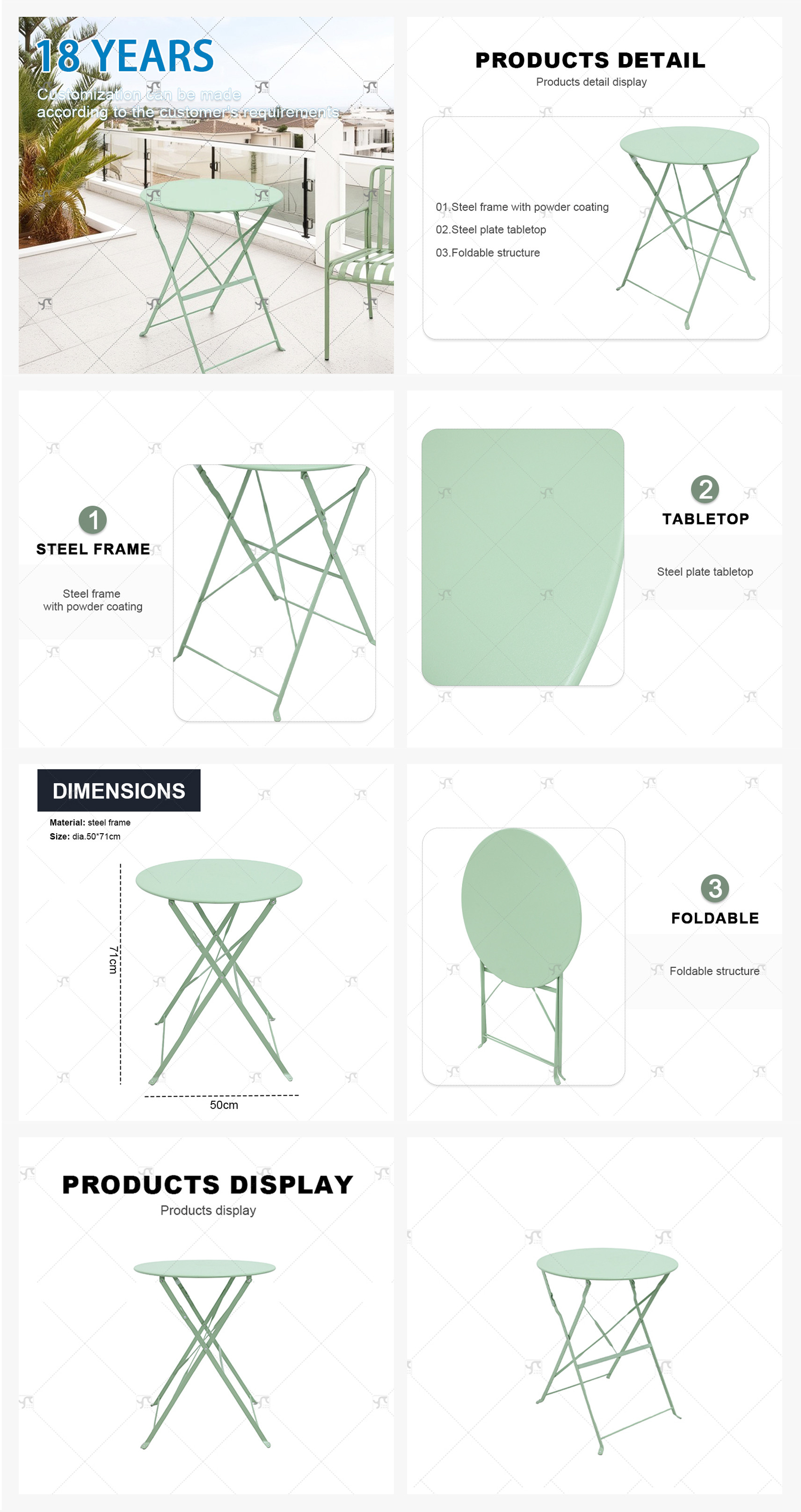 Outdoor Folding Patio Side Table Garden Round Table with Silk Printing Glass Metal Steel Iron Dining Outdoor Table